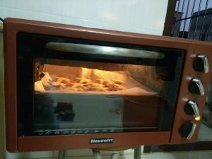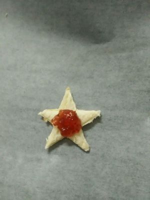 先预热,100摄氏度烤5分钟,领从冰箱里拿出来的草莓酱融化