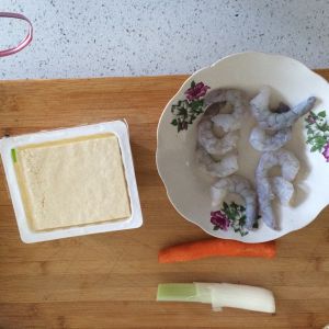 将虾仁洗干净后用牙签将黑线挑出,然后将豆腐切块,胡萝卜切丁,葱取葱白地方,和绿色的地方,分开放,将虾用料酒,胡椒粉,盐(少放),味素味一下