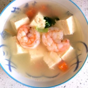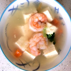 然后倒入少许油用葱白地方炝锅,注将绿色葱留下,然后加水,依次放入胡萝卜,豆腐,等水煮沸后放入腌制好的虾仁,然后煮至虾变色,再放入绿色的小葱和香菜,最后放入盐和味素,就好啦!即简单又好喝