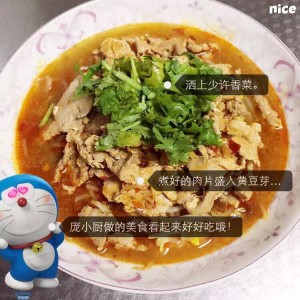 猪里脊煮好即可,一起倒入刚刚放在一旁的金针菇豆芽上,再撒入香菜装饰,大功告成!