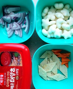 鱼饼切片,胡萝卜洗净切片,洋葱切块,准备好韩国辣酱和年糕