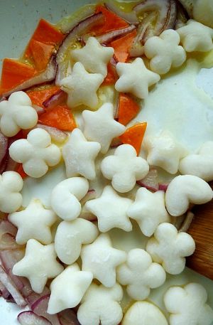 年糕的形状多样,切成片状比较容易熟透。熟透的年糕内芯是软糯的,如果内芯是硬的就是还没煮透,所以最好把年糕切片或小块。这次我用的是心形和星形的,个头小小的很萌很可爱;