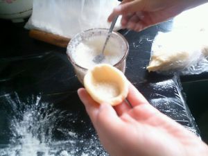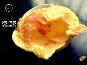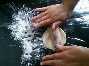 然后把面团用手弄成一个小碗一样,在里头加入绵白糖~