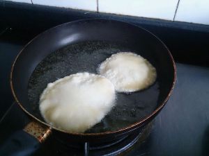 最后开始炸咯~油尽量多一些,等油烧热后,放入擀好的大饼,它会鼓起来~炸到两面金黄就可以出锅咯~