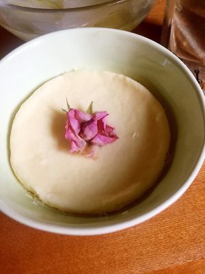 在碗上盖上盖子,放入锅中隔水炖,(我看到之前食谱中有亲建议用热水炖更好),12-15分钟就好,中间6、7分钟蛋羹稍微成形的时候加一朵玫瑰,用牙签把花瓣挑开一点,主要是装饰,一开盖的时候玫瑰的香气馥郁芬芳,继续炖。要嫩滑一点就少炖一会儿~