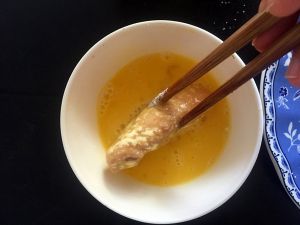 将沾好面粉的鸡翅放入蛋液里均匀沾满蛋液