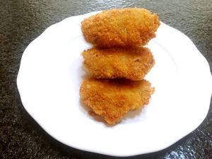 打一个鸡蛋在碗里,搅匀!一个盘装面粉,一个盘装面包糠