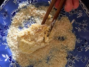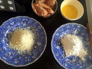 再将沾满蛋液的鸡翅放入面包糠内均匀沾满面包糠