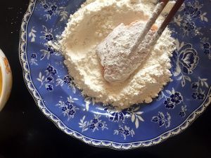 拿一个腌制好的鸡翅放在面粉里正反两面均匀沾满面粉
