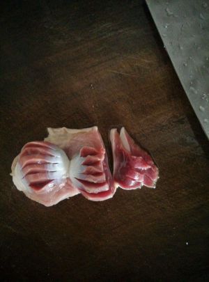 鸭肾先切横刀,再转过来切竖到,切薄片