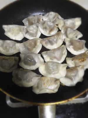 准备好平底锅和速冻水饺,水干了之后倒入适量的油,小火。