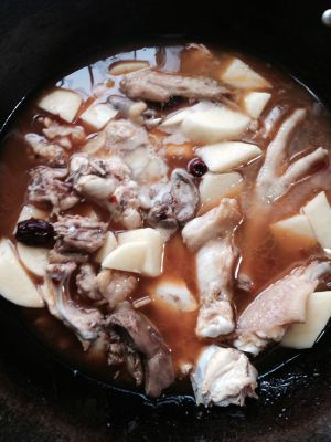 炒香后放入土豆、加水至快淹没土豆和鸡即可,焖至水快干收汁即可出锅。