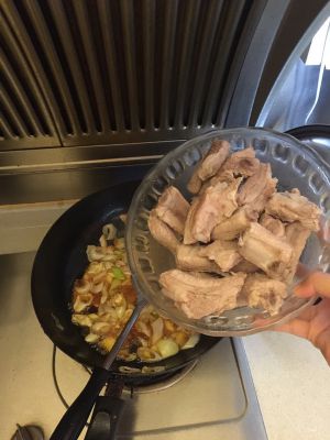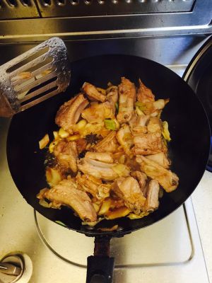 打开锅盖、翻炒排骨、改成大火炖到汤汁收干。