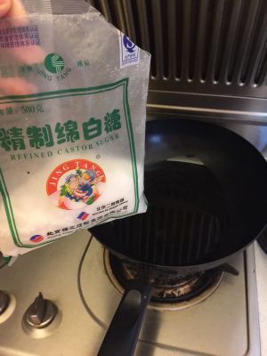 熬白糖、慢慢搅拌,把白糖搅到冒出小泡、变成深红色。