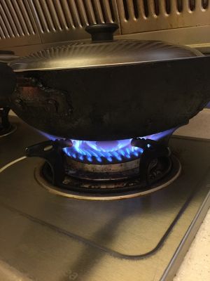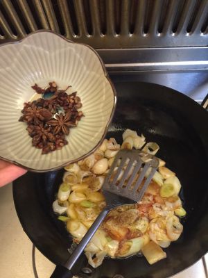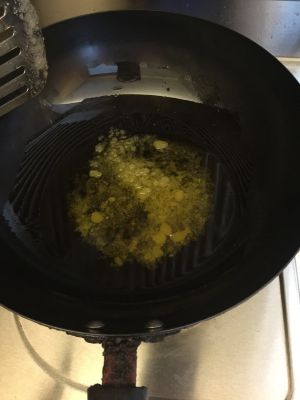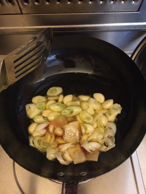 锅里倒入油,要多放些油、大概是一小碗,这样可以炸香葱姜蒜。