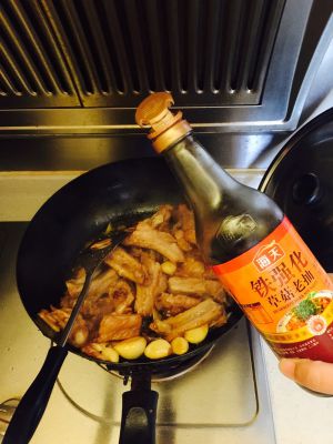 倒入老抽、可以根据喜好适量加入,我这里放了两三滴。