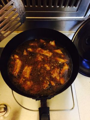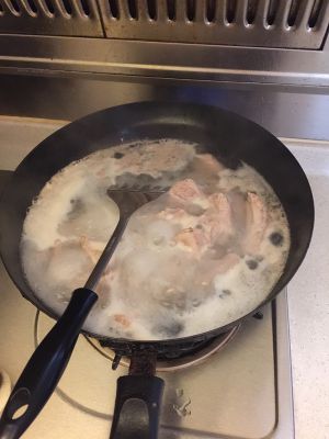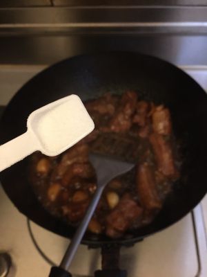 排骨煮沸了、汤汁少了些,放入盐、我放了4勺盐,可根据个人口味适量加入、翻炒均匀、改成小火炖15分钟。让汤汁满满渗入排骨里,这是可以放几滴红烧汁或海鲜酱油提鲜。