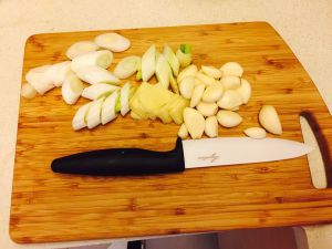 把葱切大段和小段、姜切片、蒜去皮备用。