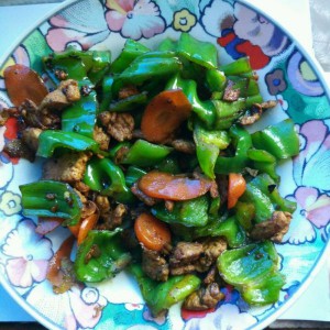 放入姜蒜翻炒,再加入青椒胡萝卜