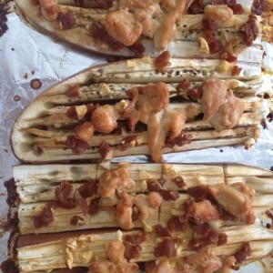 把茄子放烤盘上,蒜萝卜干淋在茄子上面,再放上鸡肉,烤箱220度烤20分钟即可。