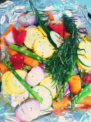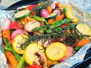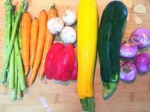 准备各种蔬菜,我用了黄绿节瓜,小胡萝卜,小洋葱,红椒,蘑菇,芦笋