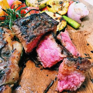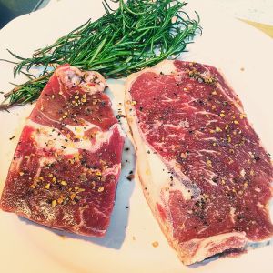 用橄榄油,迷迭香,grill mates腌制牛排两个小时,我用的西冷,上脑各一块