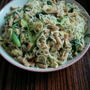 面尝起来有些许硬后,捞起来放入凉水(切忌面煮煮的太软吵起来太烂),用凉水沥两遍,沥干