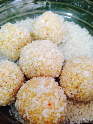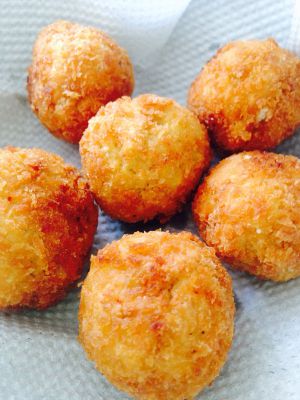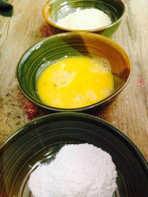 剩的鸡蛋液,淀粉,面包糠我会都倒在一起,团圆,再滚一圈面包糠