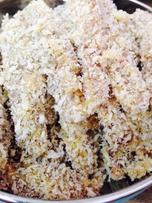 沾完面包糠,放一个空碗里,上道工序需要一根一根鸡柳逐次进行