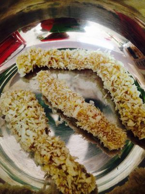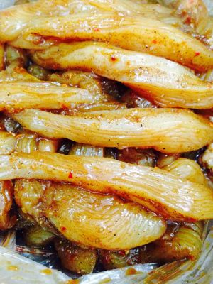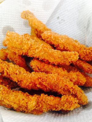油烧热,一根一根鸡柳下油锅,炸至金黄色
