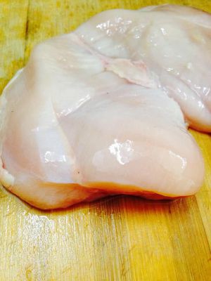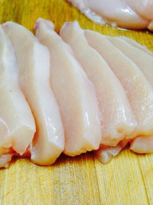 切好的鸡柳入碗中,把盐、鸡精、辣椒面、料酒、生抽、五香、十三香、孜然、黑胡椒倒在鸡肉条里,搅拌,腌渍30-60min,一般为了入味更好,我会提前三个钟头左右就腌制