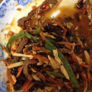 牛肉水干了以后,火小点煸炒一勺郫县豆瓣酱,炒一会倒入葱姜蒜末。倒入所有配菜混合炒,倒入已经调好的汁,最后撒入水淀粉,收汁。这个菜不要放盐