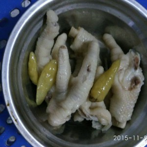 迅速捞出放入冷水中冲去鸡爪的油脂。最好再放入些冰块。待鸡爪凉了以后捞出。