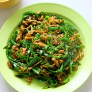 锅烧热搁油将切好的肉丝下锅炒熟,再搁青椒。