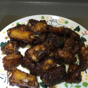 2 把排骨晾在一边,烧油,下几片或者不下姜片,然后放入排骨开始炒,大火,看到肉略至金黄开始加老抽,生抽。
