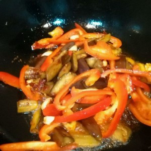 下油,热锅,炒豆瓣酱+大蒜+茄子+青椒,旺火翻炒2分钟,后加盐,鸡精,味精食量哦,解放天性的炒完熟了,香气四溢,完成。