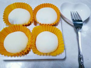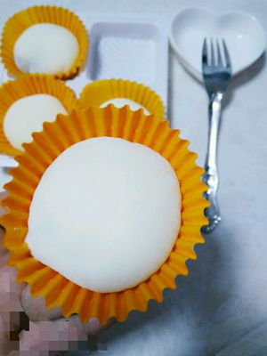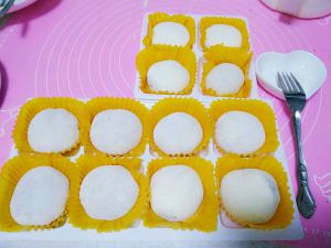 回到第二步骤,戴上一次性手套把皮按25一个分好,沾点熟粉,开始包了,先放点奶油,在放奥利奥,像包包子一样把口收起,把收口那面朝下,光滑朝上,雪媚娘就这样做好了,把做好的雪媚娘放进冰箱,冰下口感非常好,记住一定要盖保鲜膜或者保鲜袋,如果这样直接放冰箱什么也不盖会很硬很干。