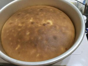 用切拌手法混合均匀,不要打圈搅拌,混合好后加入8寸模具中。倒入后在桌子上振几下,震出气泡。