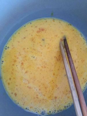 拿2个无水无油的大盆,分别装5个蛋黄和蛋清。在蛋黄中加入60ml牛奶和60ml食用油,搅拌均匀