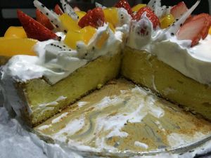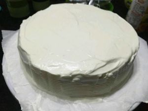 用刮刀和切刀将奶油涂抹于蛋糕侧面及上面,侧面我用锯齿刮刀做了下造型,亲也可以自己设计