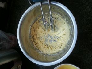 黄油软化打发,加入糖粉,将鸡蛋液分三次加入黄油糊中!搅拌均匀再加入牛奶,搅匀加入低筋粉,放入锅中蒸15分钟放凉!待用!*^O^*