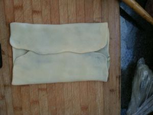 顺长卷成卷(皮要擀薄点,这样层才会多哦!)切成小段,像擀饺子皮样压扁擀成圆皮!包上奶黄馅(用包包子的方法收口)