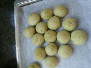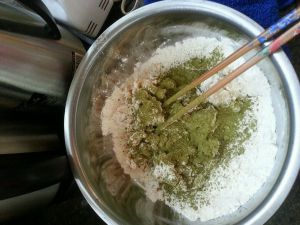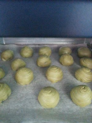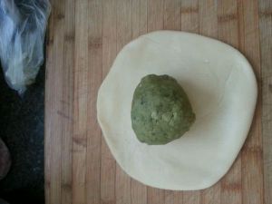 油酥馅面粉,抹茶粉混合!加化开的白油,揉成面团!