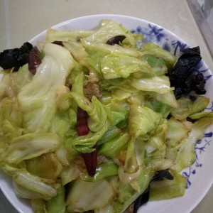 然后把 圆白菜和木耳倒入锅里翻炒 锅干的时候 可以滴点水 在锅里 注意别糊锅 超炒到 圆白菜 变小就可以了