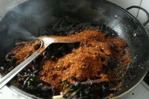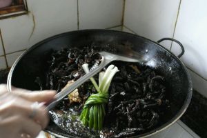 3、放入葱姜翻炒,下糖,倒入适量水后,收汁。