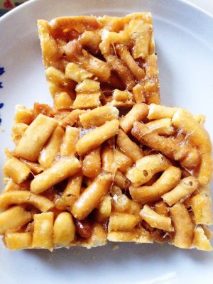 将沾好糖稀的面条倒入不沾模具,迅速压平,稍微冷却后倒出切块