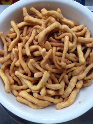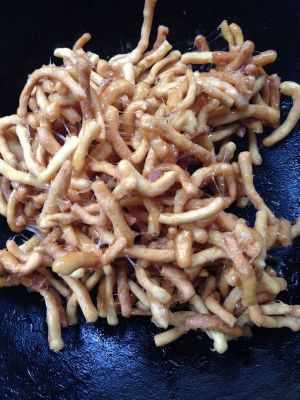倒入炸好的面条根根,快速翻炒,使糖稀沾在面条上