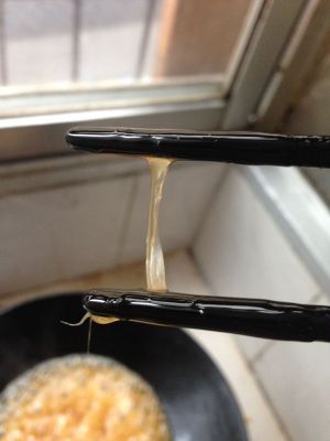 用筷子沾点糖稀,检查拉丝情况,稍凉下能拉丝就OK了