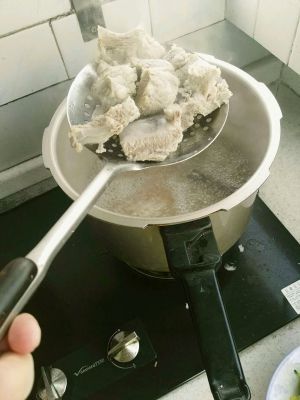 斩好的排骨块 放凉水中泡泡血水。洗净后,冷水下锅,煮至开,撇干净浮沫。