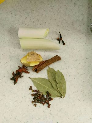 排骨焯水的同时,高压锅烧开水(没过排骨的量即可),放入适量八角、桂皮、香叶、花椒、葱段、姜块、丁香(没有就不放),煮一煮